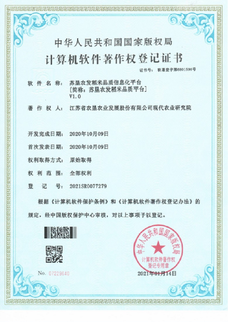 • 2021年1月,蘇墾農科院成功獲得《蘇墾農發稻米品質信息化平臺》(登記號:2021SR0077279)國家版權局頒發的計算機軟件著作權登記證書,這標志著蘇墾農發稻米品質評價體系經過近三年的科學研究和技術攻關,取得了階段性的成果。