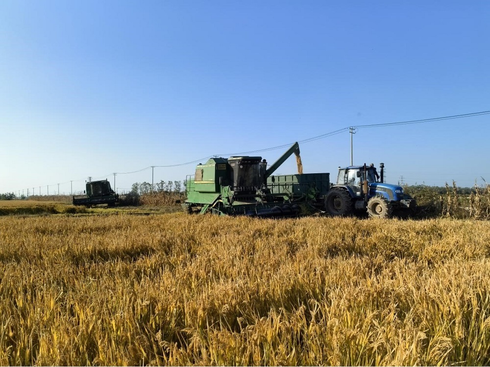 接連成片的稻田上,收割機馬力全開,運糧車在田間有序穿梭,收割、脫粒、裝車一氣呵成。