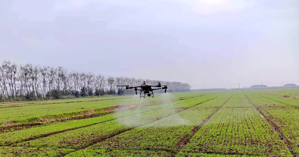 在東陬生產區(qū),綠油油的麥苗長勢喜人,植保無人機在操作人員的控制下,按照設定好的航線來回穿梭,均勻地將藥液噴灑下去。“現(xiàn)在無人機打藥用水量3.5L,不僅打的透,不重不漏,而且能夠精確控制藥量,減少農藥浪費,達到節(jié)本增效的目標,作業(yè)效果非常好。”生產區(qū)技術員喬文忠介紹說。